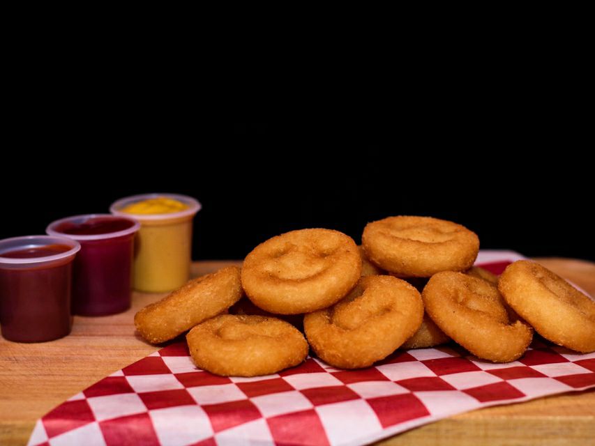 Mitad salchipulpos y mitad papas.