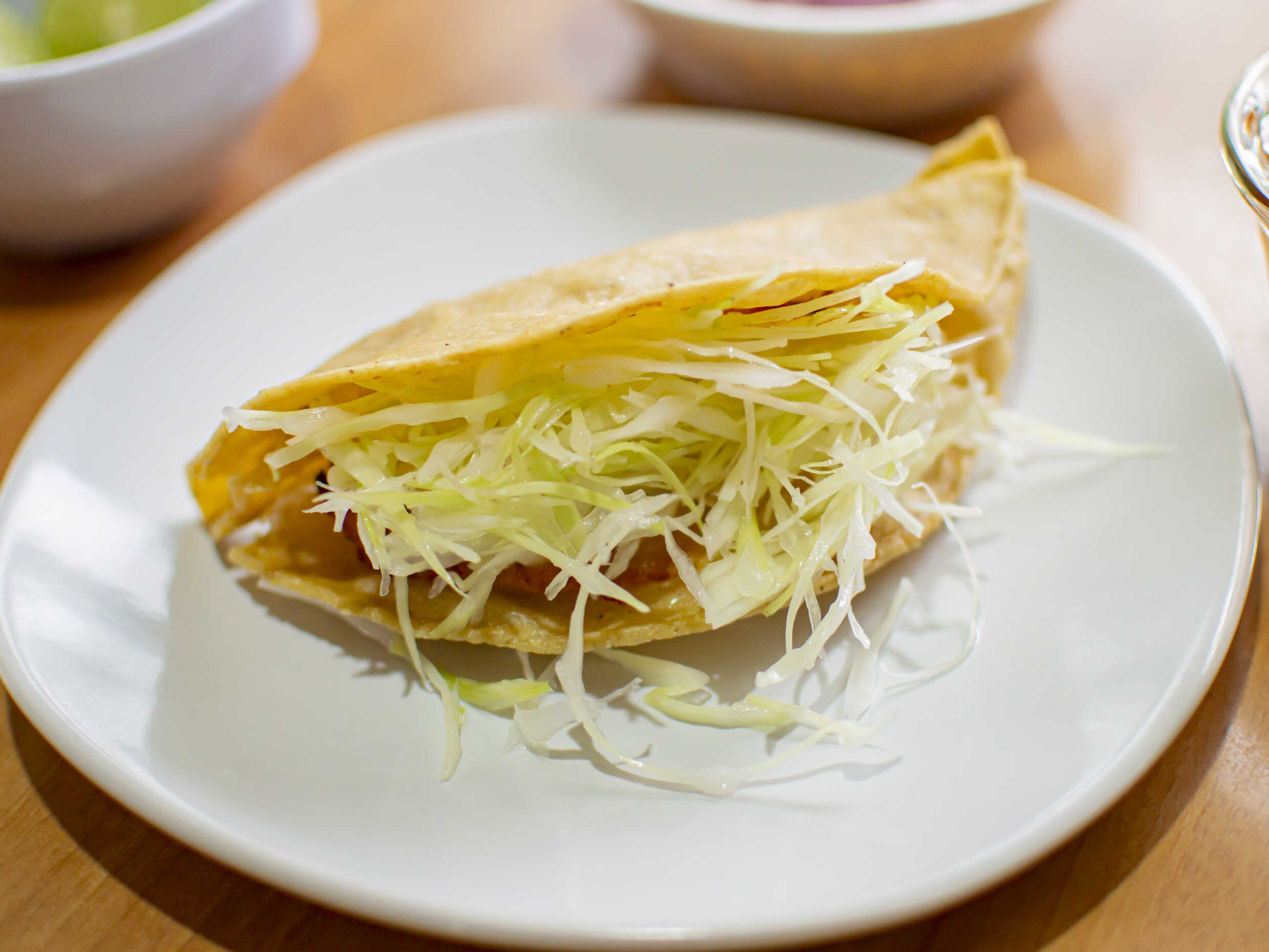 Taco de Frijol Ahogado, un taco dorado e ingredientes son extras