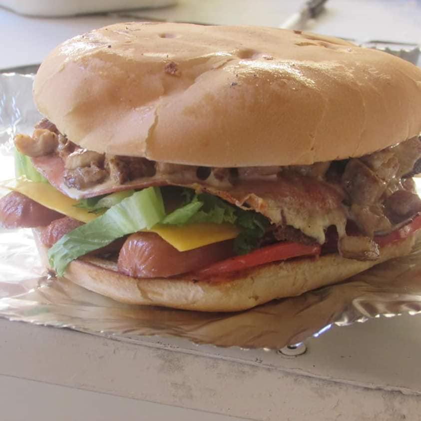 Triple carne, triple Q. Amarillo, salchicha, queso, tocino, jamón, jitomate, cebolla caramelizada, aguacate, lechuga, picante y aderesos