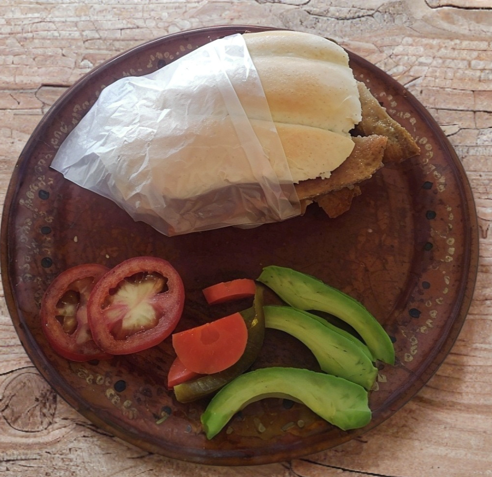 Milanesa, aguacate, jitomate, picante y mayonesa