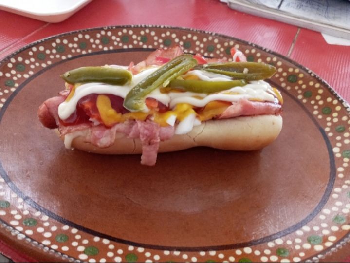 Salchicha con salsa de chipotle, aguacate, jitomate,chile Manzano y mayonesa