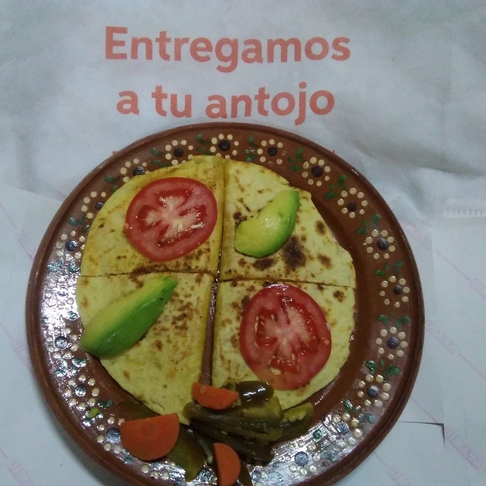 Tortilla de harina, jamón, queso amarillo, q.oaxaca, jitomate aguacate y picante