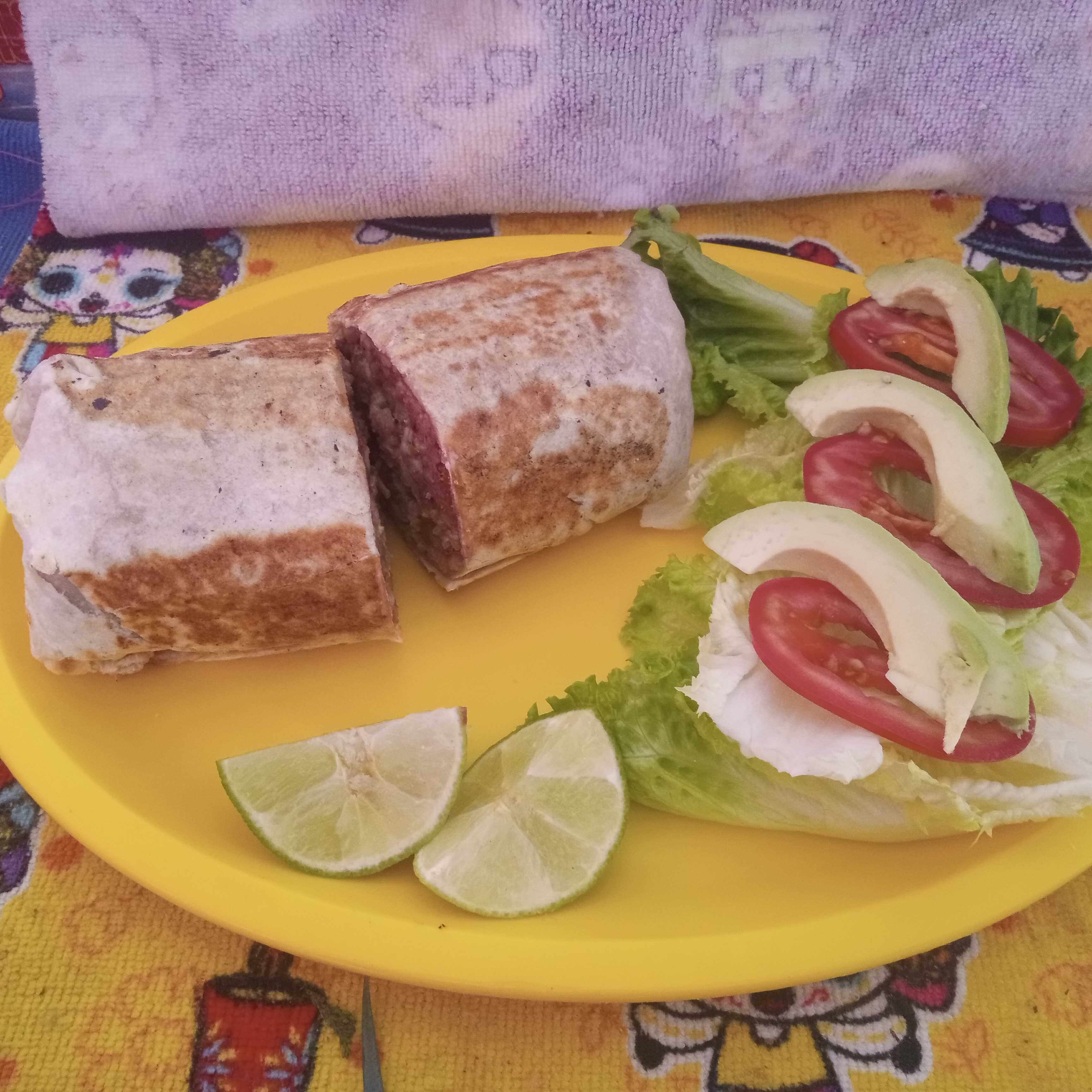 Tortilla de harina, frijol, chorizo, jitomate, aguacate y lechuga