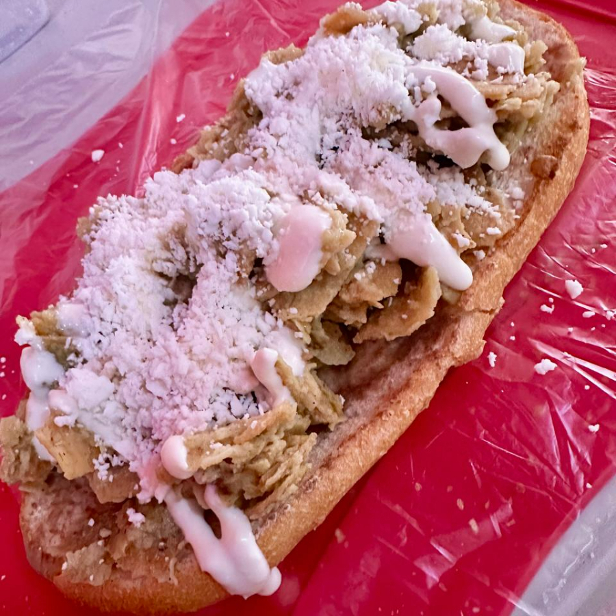 Deliciosa torta de chilaquiles rojos de 20cm. con pollo deshebrado, con frijoles, crema y queso.