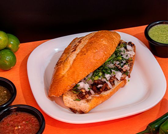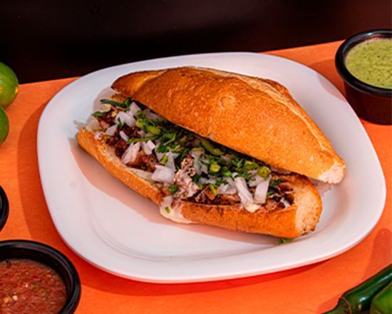 Sabrosa torta de suadero en bolillo de tamaño normal.