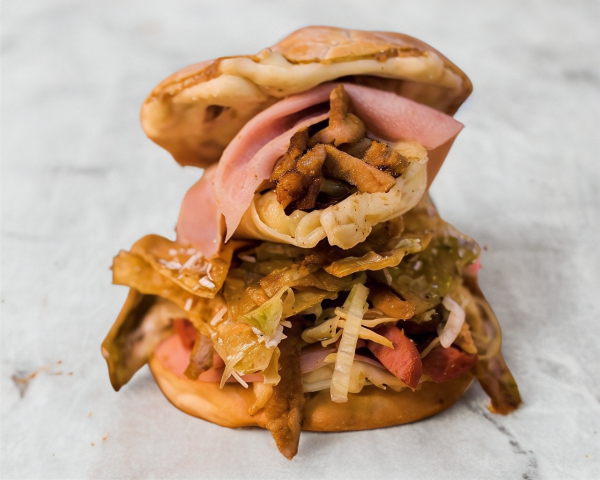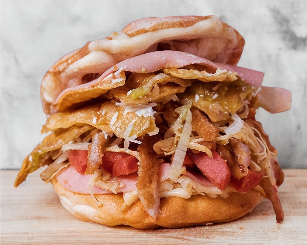 Milanesa, salchicha, doble jamón, doble queso, pollo, chorizo, chilaquiles y un burrito adentro.
