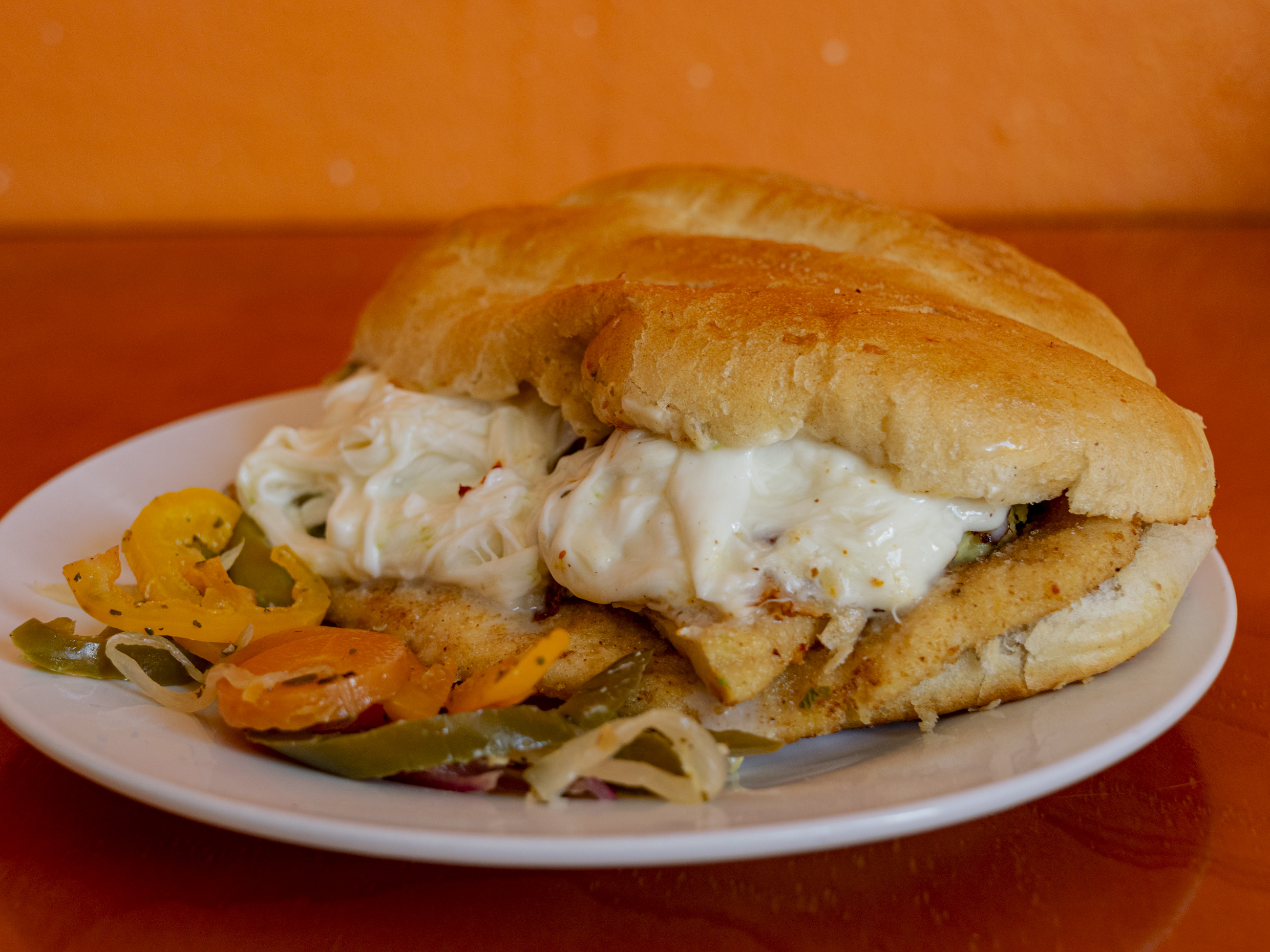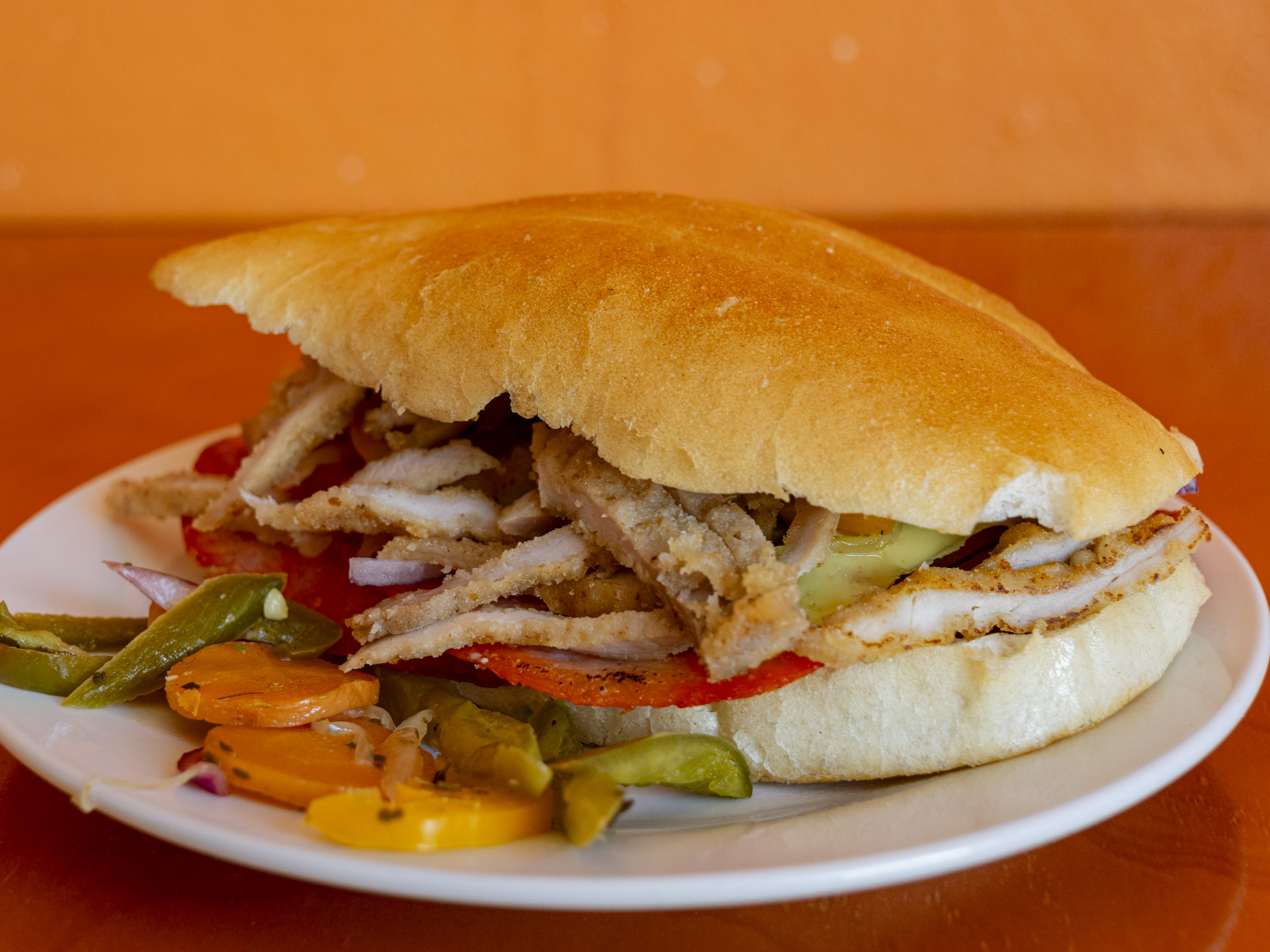 Milanesa de pollo, aguacate, jitomate, cebolla, rajas o manzanos, crema y frijoles