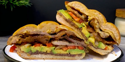 Torta con aguacate, jitomate, cebolla, rajas, chipotle, milanesa de cerdo, chorizo, queso amarillo y quesillo.