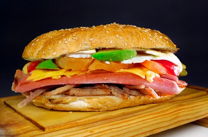 Torta con aguacate, jitomate, cebolla, rajas, chipotle, pierna española, huevo, queso amarillo y quesillo.