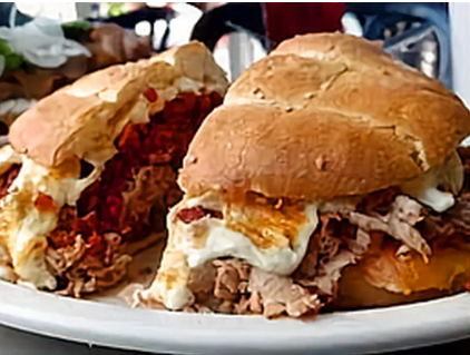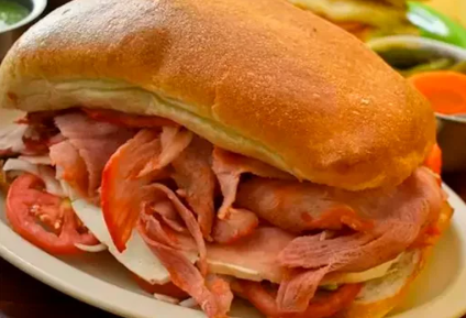 Torta con pierna española, piña, queso amarillo y quesillo aguacate, jitomate, cebolla, rajas, chipotle, pierna española, piña, queso amarillo, quesillo.