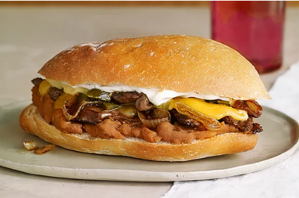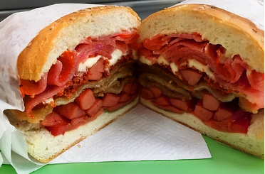 Torta con aguacate, jitomate, cebolla, rajas, chipotle, bistec encebollado, chorizo, quesillo.