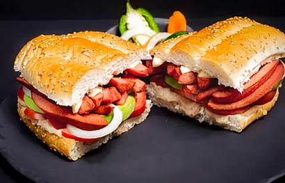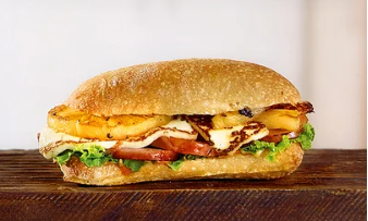 Torta con salchicha, piña, queso amarillo y quesillo aguacate, jitomate, cebolla, rajas, chipotle, salchicha, piña, queso amarillo, quesillo,