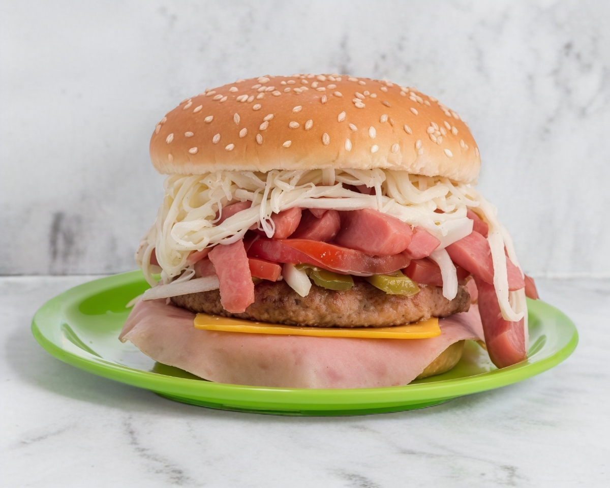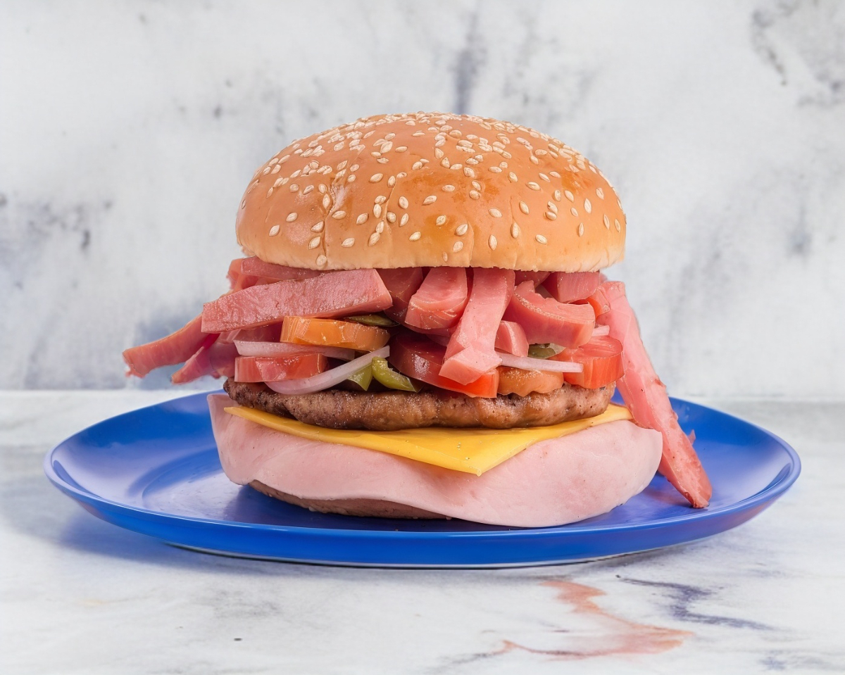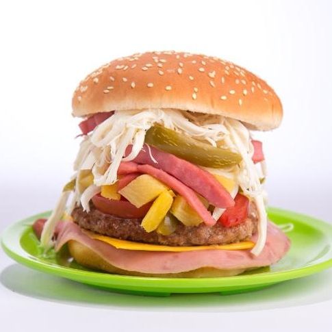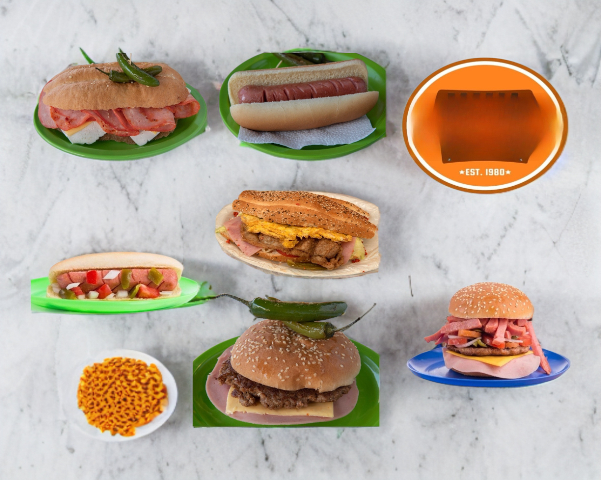 Jugosa Carne 100% de res, jamón, queso amarillo, piña, verdura y Aderezos.