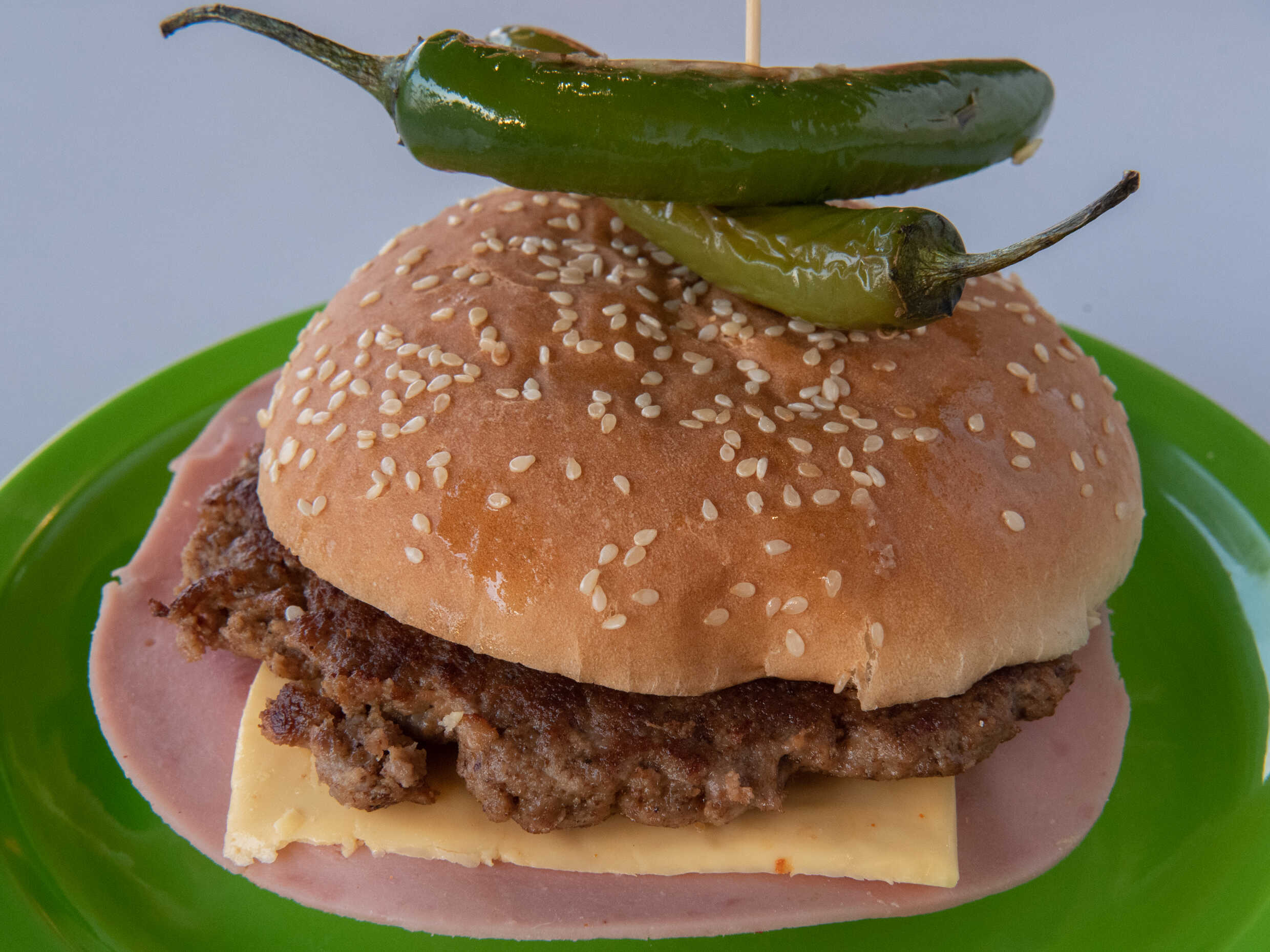 Jugosa Carne 100 % de Res, Jamón, Q. amarillo, verdura y Aderezos.