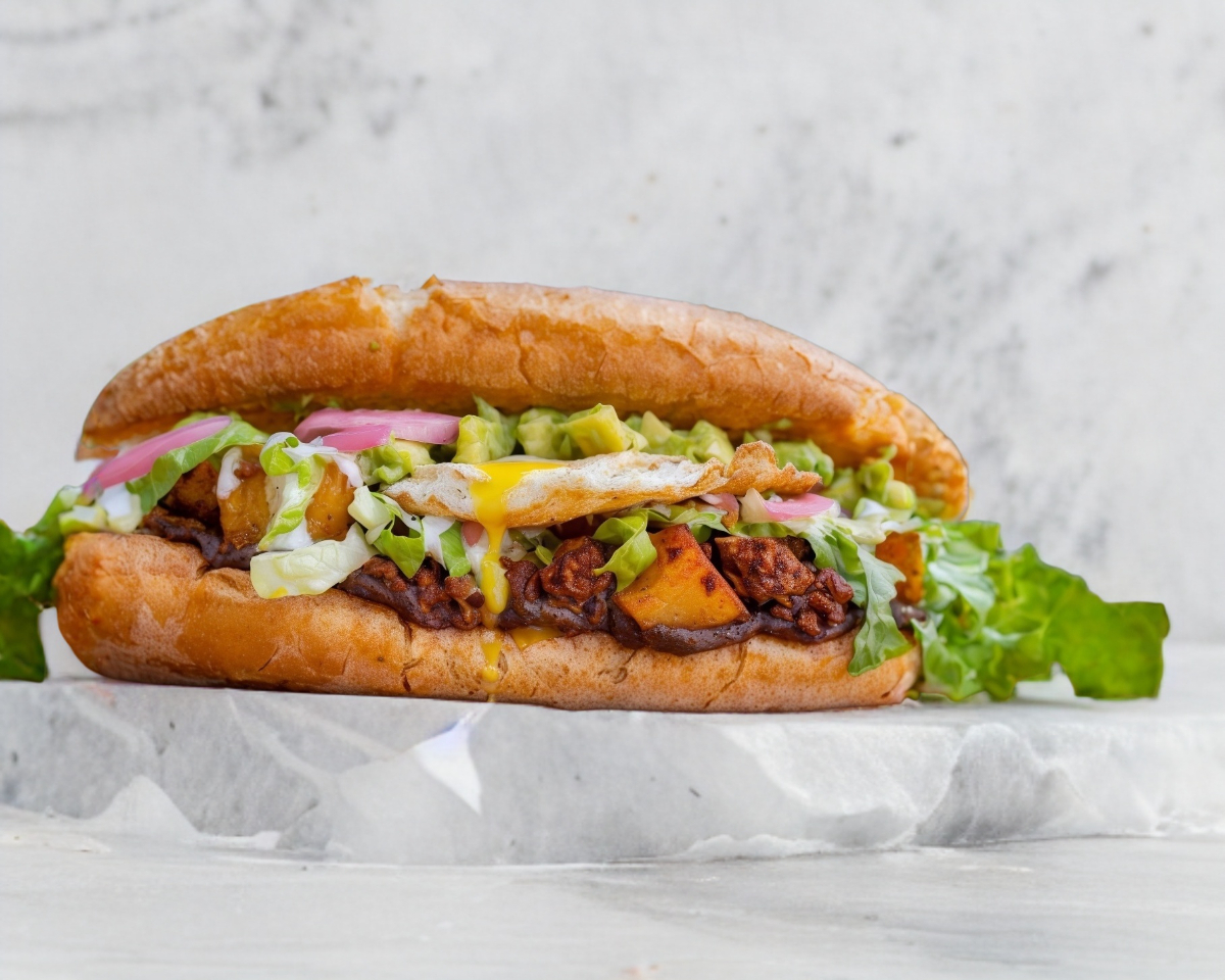 Milanesa, queso amarillo, queso Oaxaca, frijol, aguacate, lechuga, jitomate, cebolla, mayonesa y chiles.