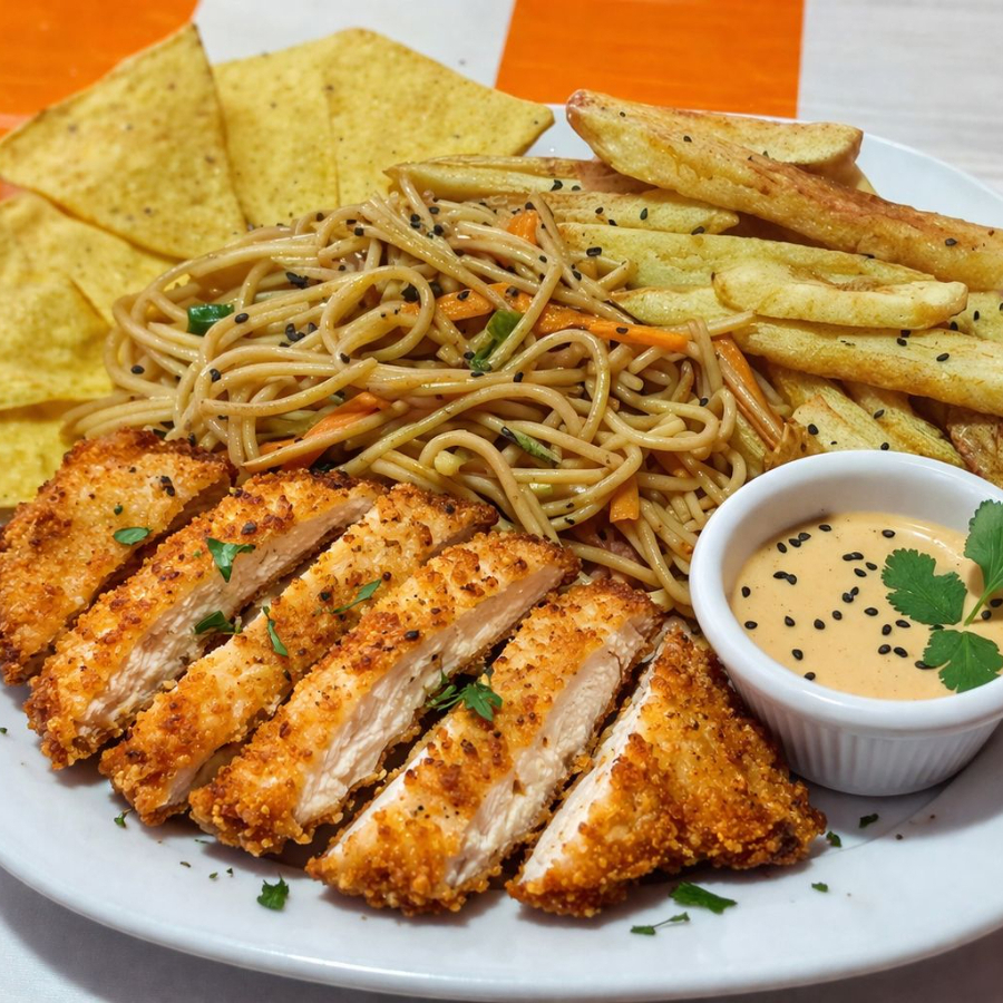 Fideos chinos con milanesa de pollo. Acompañados con papas a la francesa, totopos y dip de chipotle.