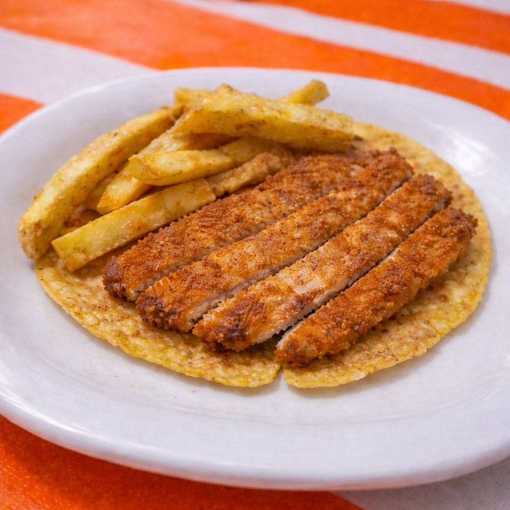 Taco milanesa con tortilla hecha a mano. Acompañado de papas a la francesa, cebolla caramelizada, nopales, limones, cebolla, cilantro y salsa.