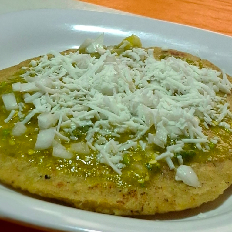 Gordita de chicharron prensado, acompañada con crema, queso, cebolla, cilantro y salsa.