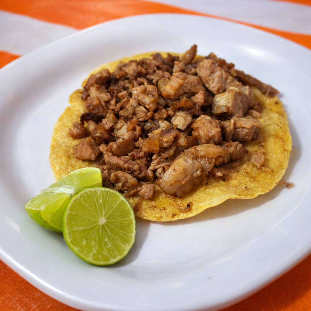 Taco carnitas maciza con tortilla hecha a mano. Acompañado de cebolla, cilantro, limones y salsa.