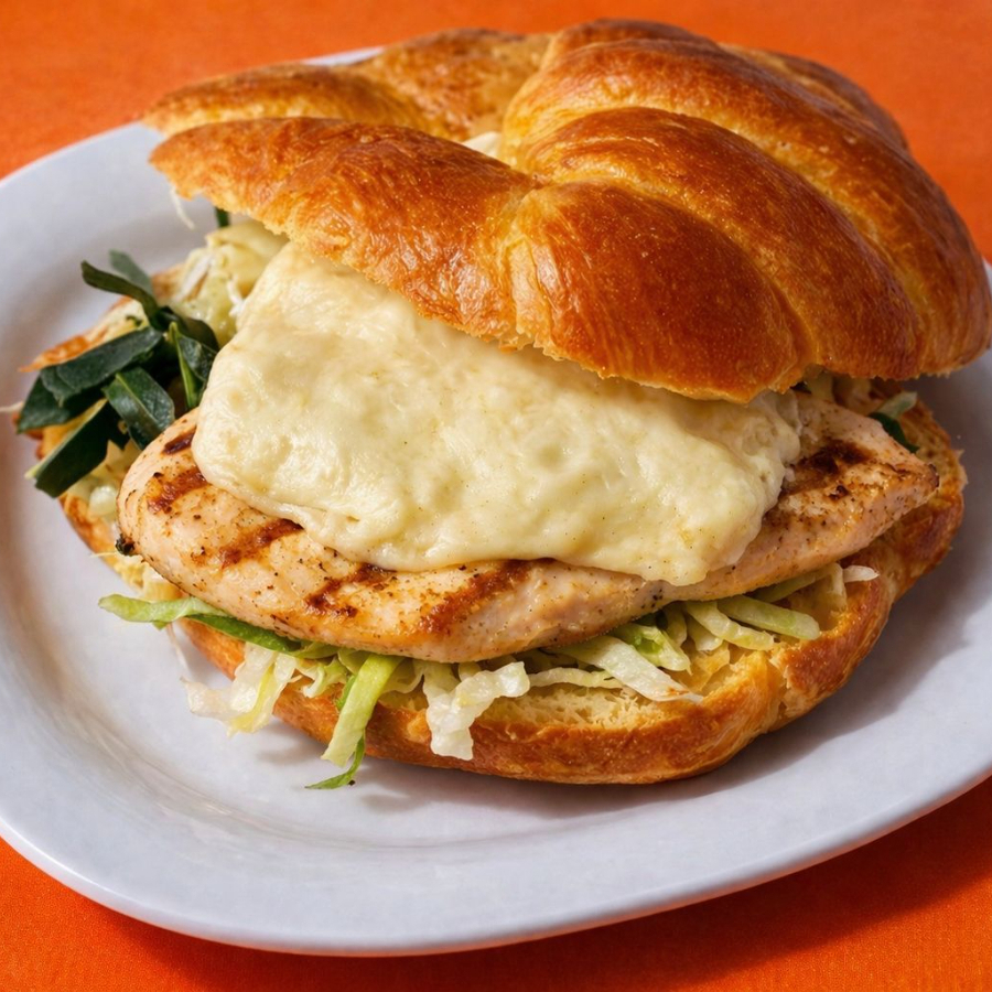 Cuernito de pechuga asada. tapa inferior mayonesa, tapa superior dip de chipotle. Acompañado con jamón, lechuga, jitomate, chile jalapeño, queso oaxaca y aguacate.