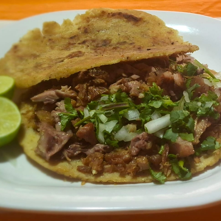 Gordita gigante rellena de carnitas, acompañada con cilantro, cebolla, limones y salsa.