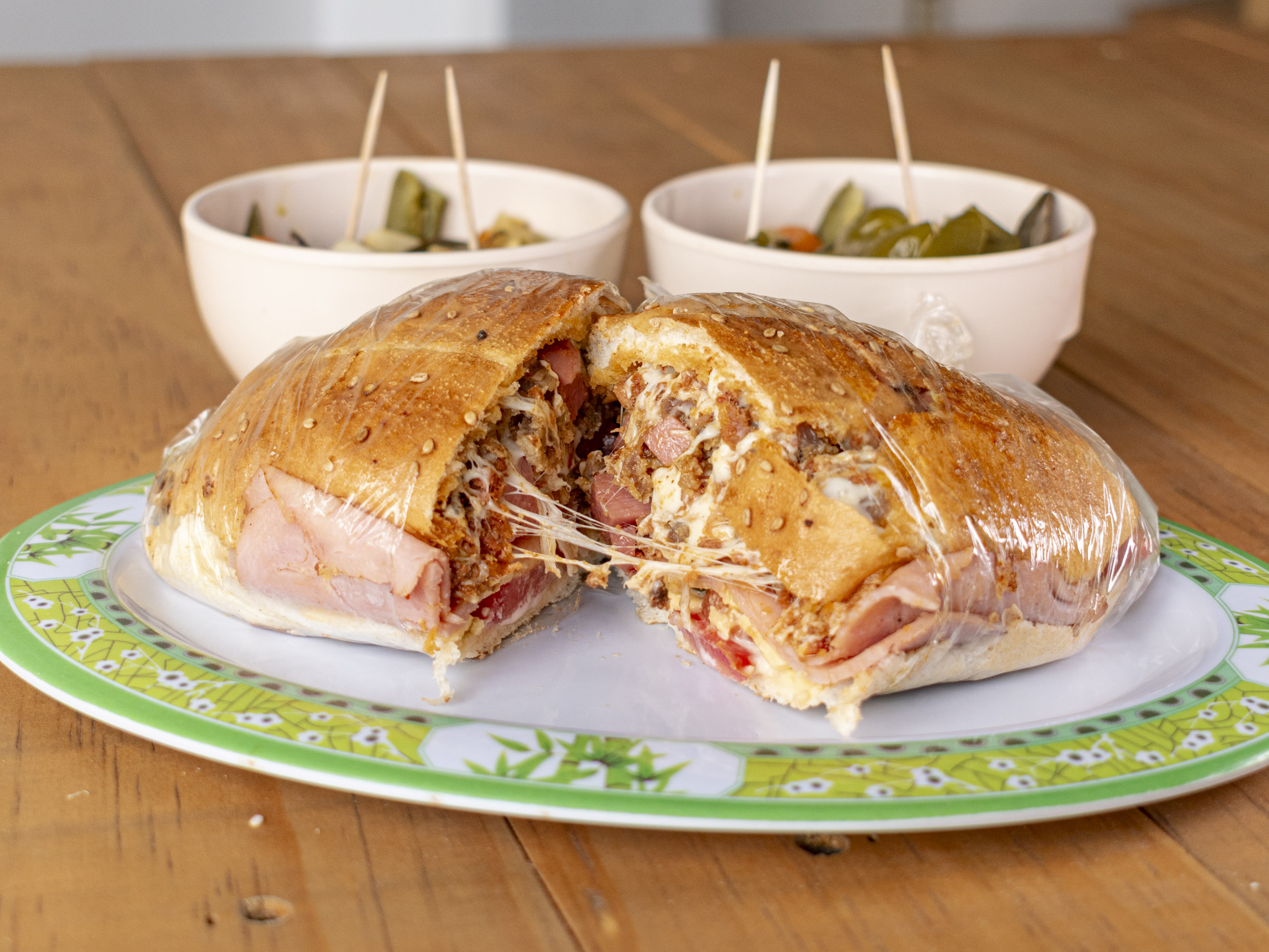 Jamón, Queso Amarillo, Queso Oaxaca, Queso Blanco, Piña, Crema, jitomate, aguacate y chiles en vinagre