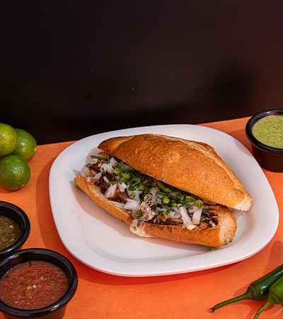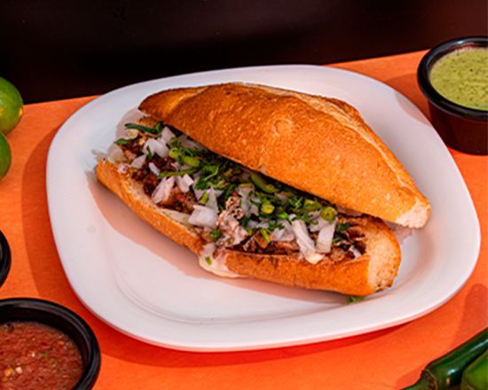 Sabrosa torta de bistec con chorizo verde en telera de tamaño tradicional