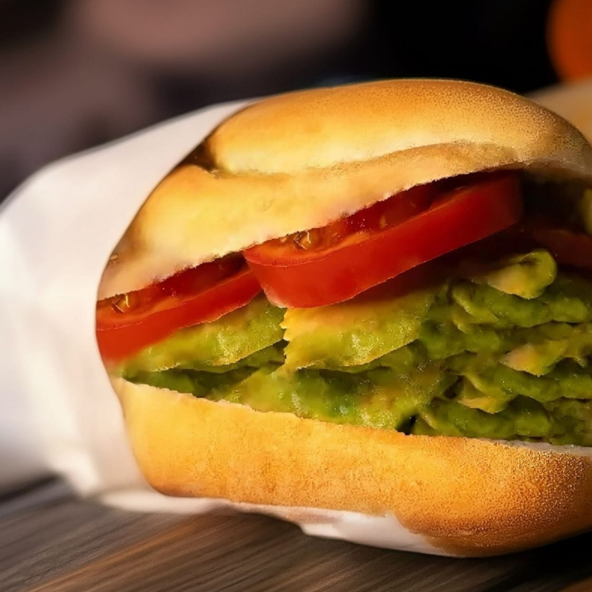 Pan de telera con aguacate, preparada con crema y jitomate. Picante a elegir entre Salsa Verde, rajas y Chiles Manzanos.