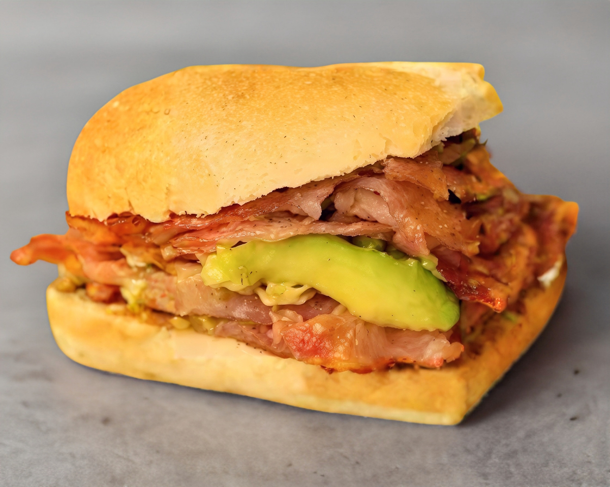 Pan de telera con Pierna Horneada, preparada con crema, jitomate y aguacate. Picante a elegir entre salsa verde, rajas y chiles manzanos.
