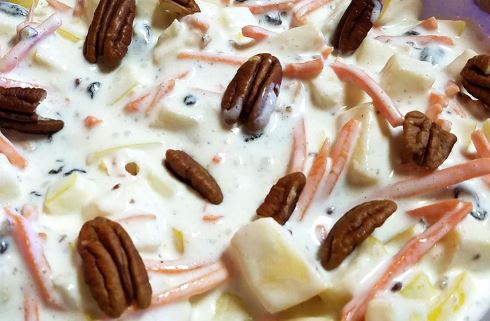 Zanahoria rayada con manzana en cuadritos, mezclada con azúcar y crema