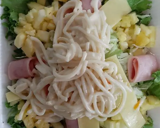 Lechuga, jamon, manchego, pasta y piña, aderezo mil islas