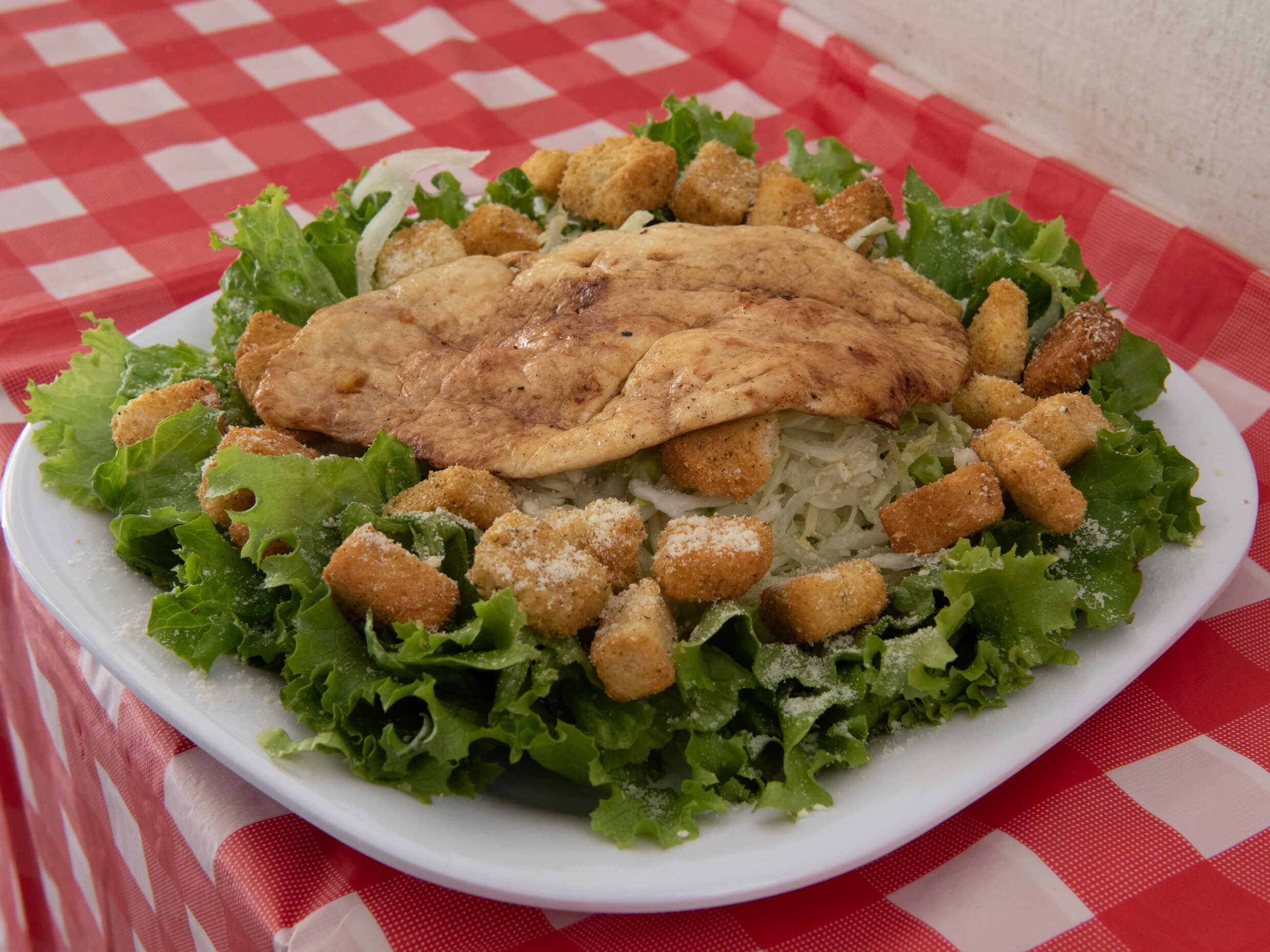 lechuga, parmesano, crotones, pechuga asada, aderezo cesar