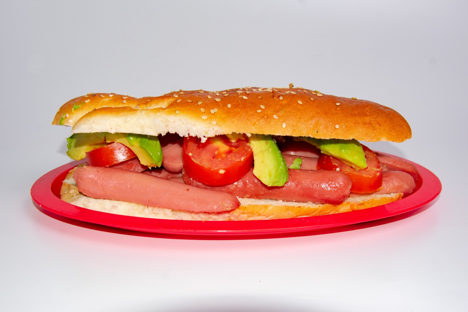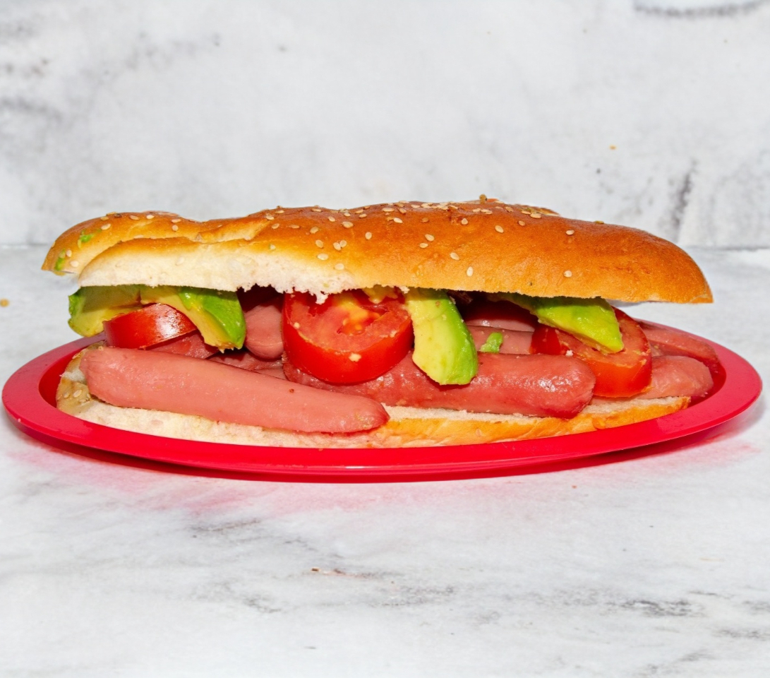 Torta con salchicha de pavo, acompañada con mayonesa, frijoles, jitomate y aguacate.