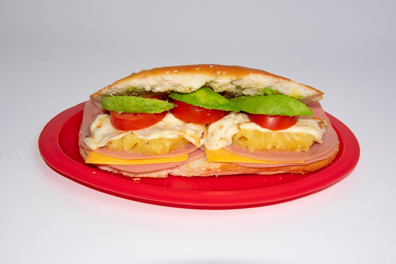 Torta con jamón, piña, queso oaxaca, queso amarillo, acompañada con mayonesa, frijoles, jitomate.