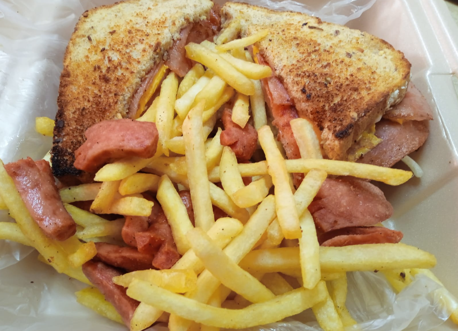 Club sándwich (jamón, queso amarillo, pollo deshebrado, tocineta y queso Oaxaca) acompañado de papas a la francesa y agua de litro de sabor o coca cola de 600ml