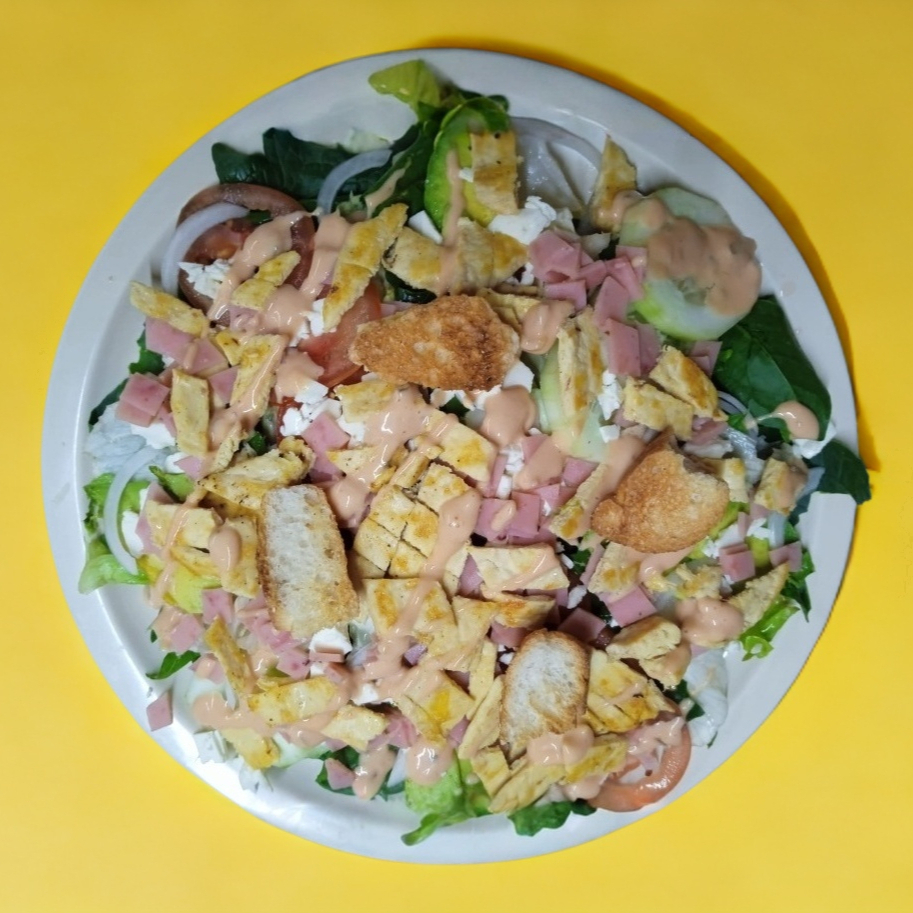 Lechuga, espinaca, jitomate, cebolla, aguacate, pepino, jamón, queso panela, aderezo al gusto, crutones y agua de sabor de frutas naturales