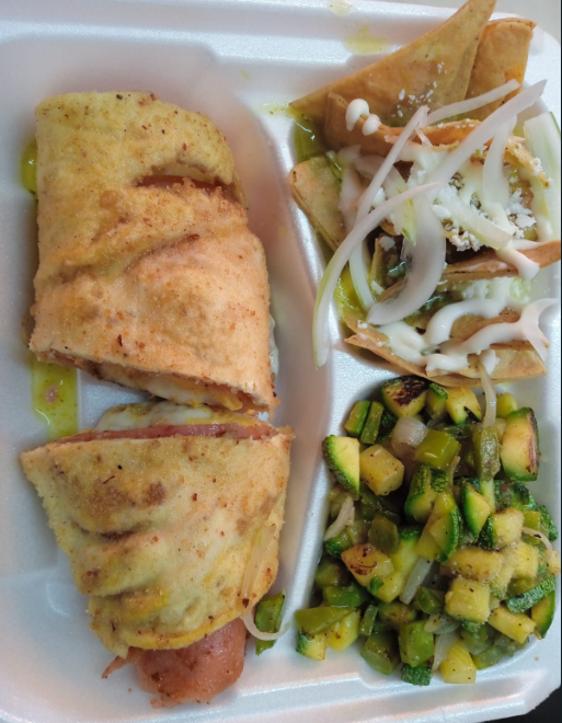 Pechuga rellena de jamón, queso amarillo, queso Oaxaca, con guarniciones de verduras asadas, chilaquiles y su agua de frutas naturales de litro de sabor