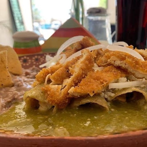 1/2 de enchiladas (3pz, rellenas de pollo) acompañado de milanesa, frijoles refritos, pan telera y jarrito de 600ml o 1/2 de agua de sabor.