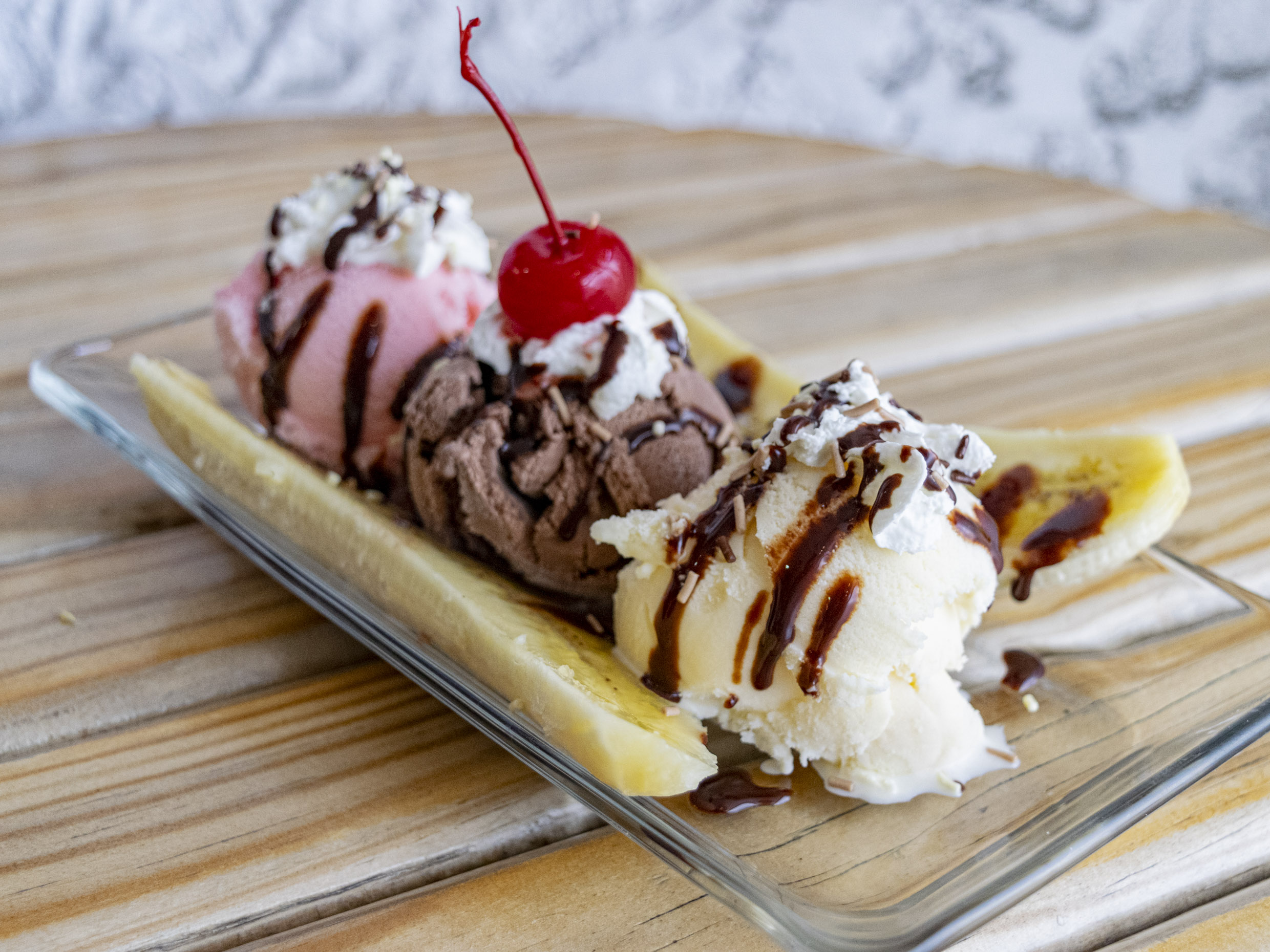 Irresistible crema de avellanas con cacao, plátano, acompañado de helado de chocolate.