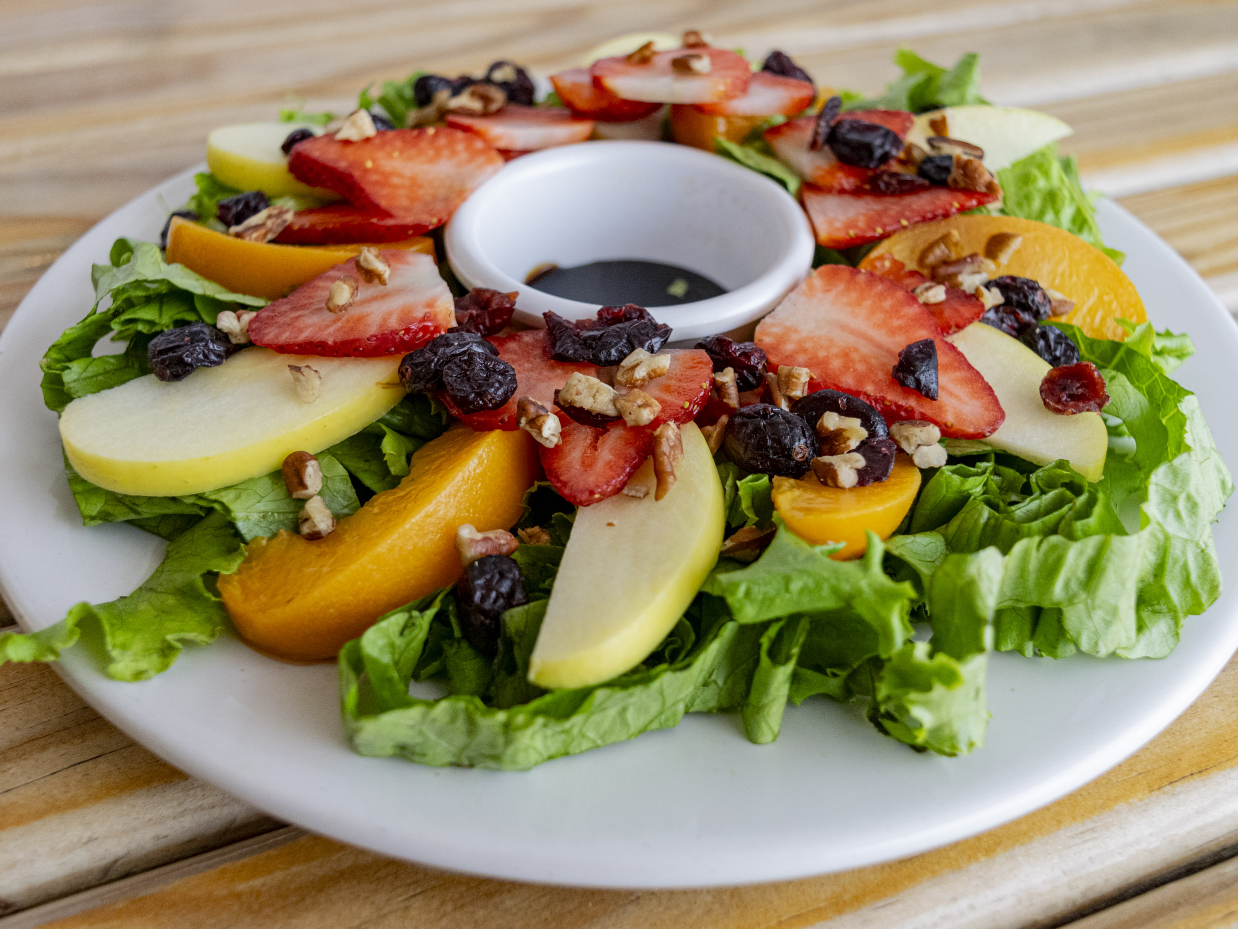 Mezcla de lechugas, manzana, durazno, fresa, nuez, arándano y aderezo balsámico.
