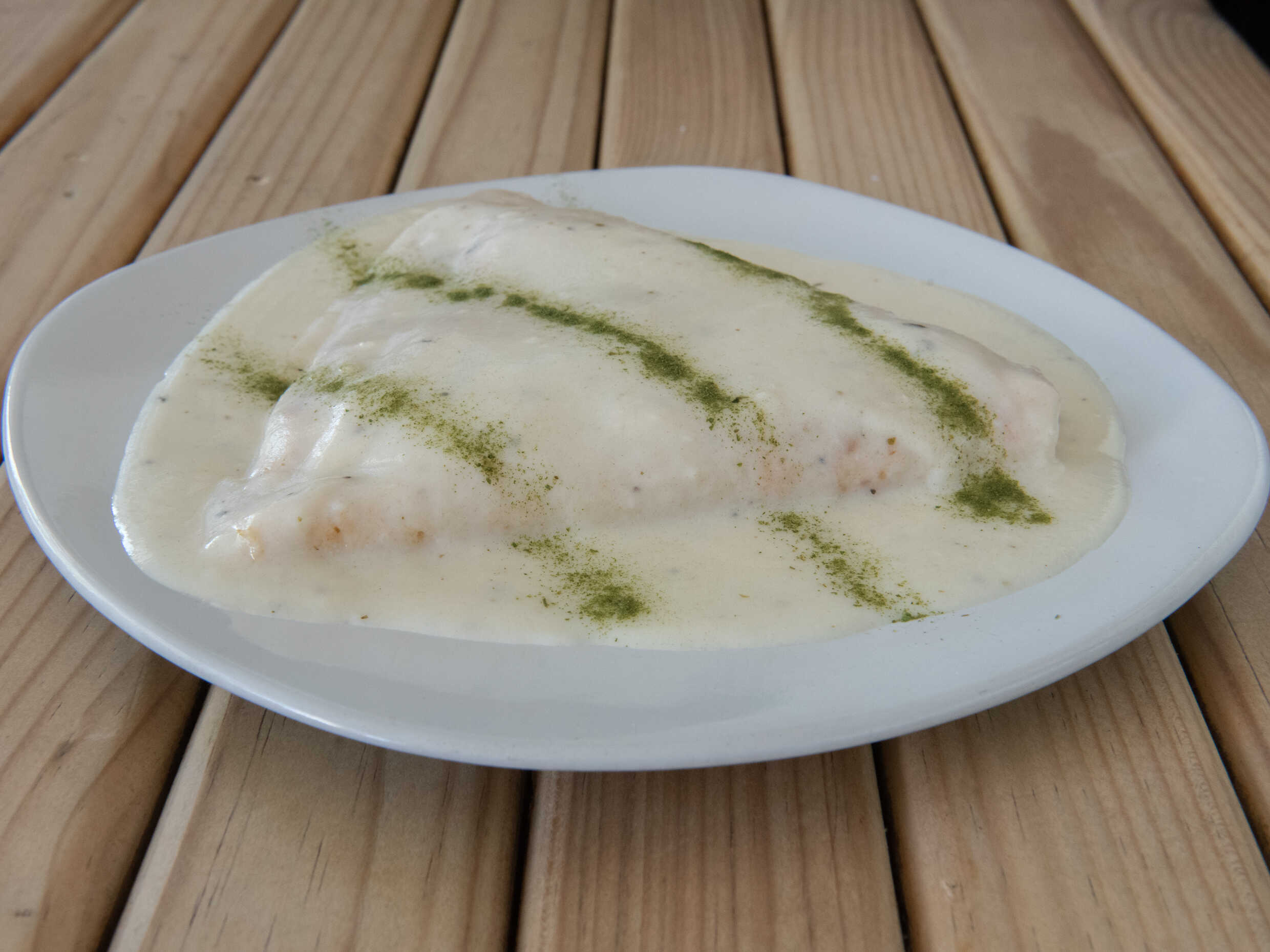 Con escalopas de pollo bañadas en salsa verde.