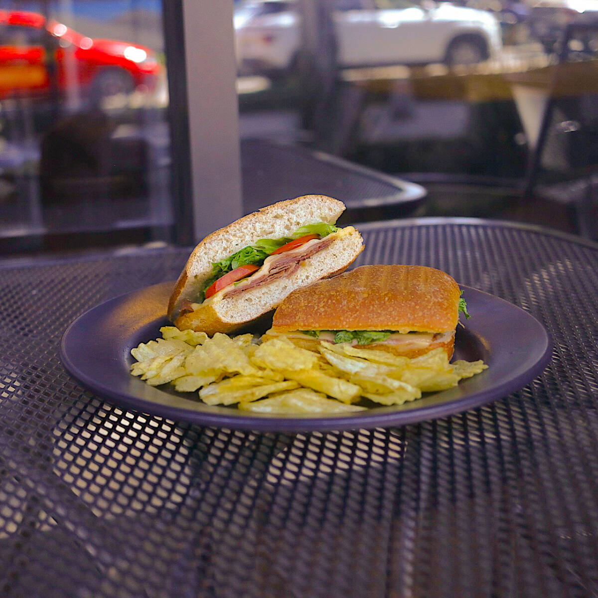 Los clasicos paninos true Coffee con mayonesa, pepino, lechuga y jitomate, acompañados de chips de papas.