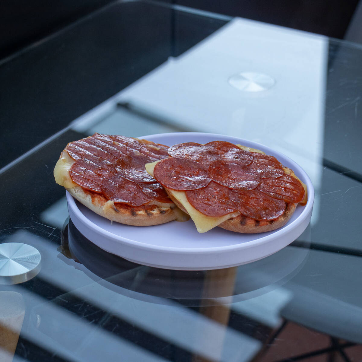 Bagel estilo pizza con salsa, queso manchego y pepperoni.