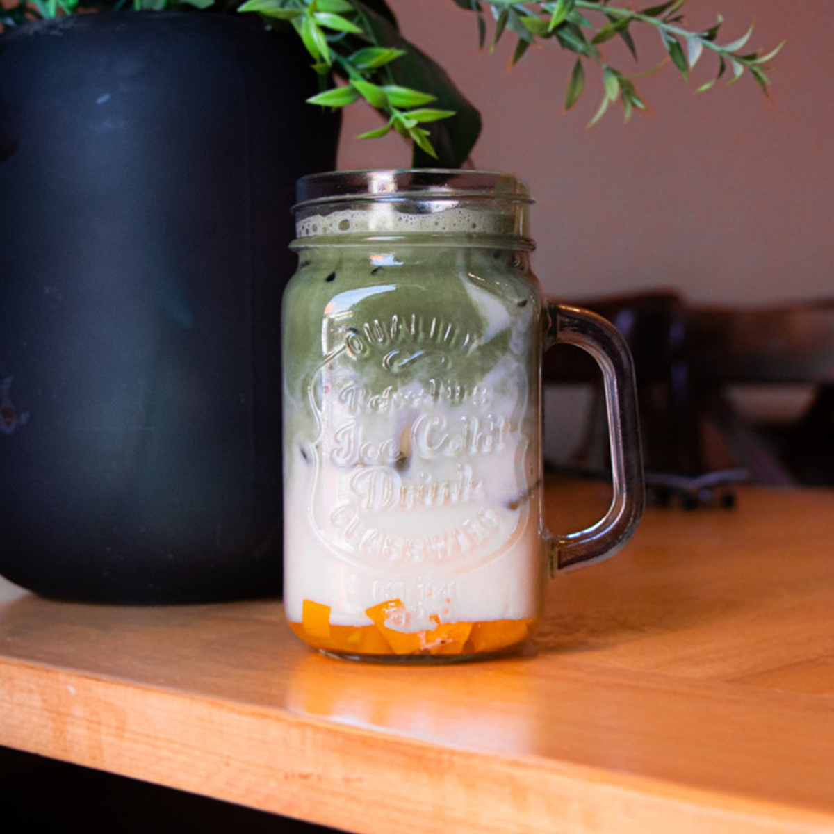 Waffle de matcha concrema de cítricos, duraznos en almíbar y nuez garapiñada.