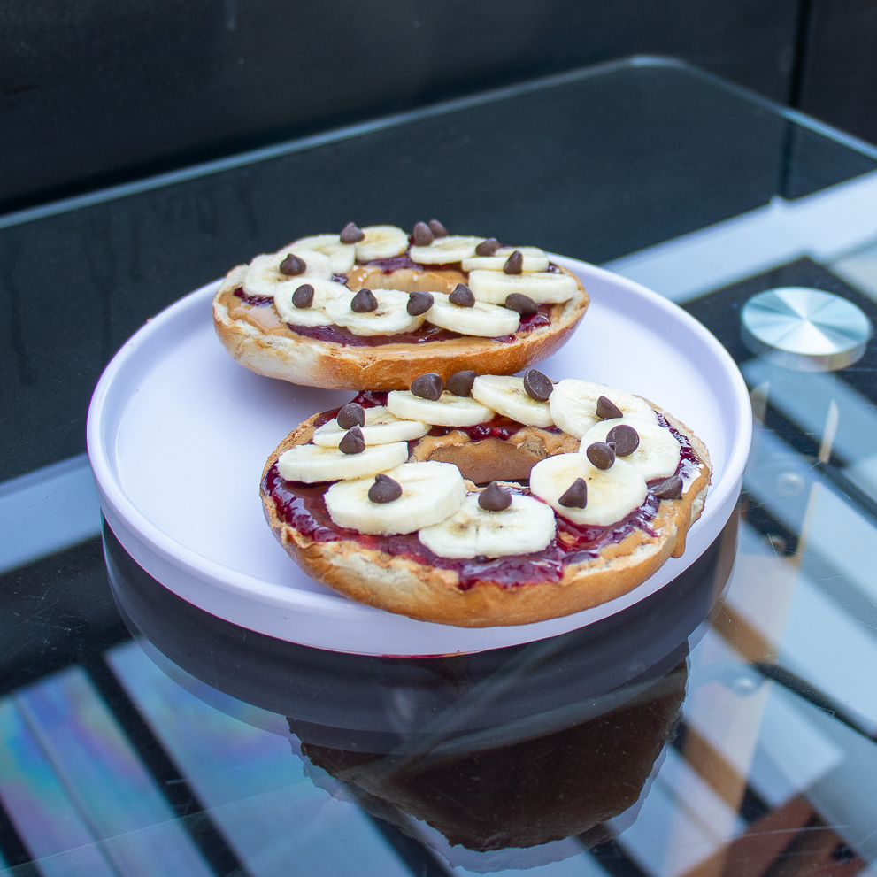 Bagel con crema de cacahuate y compota de frutos rojos, plátano y chispas de chocolate.
