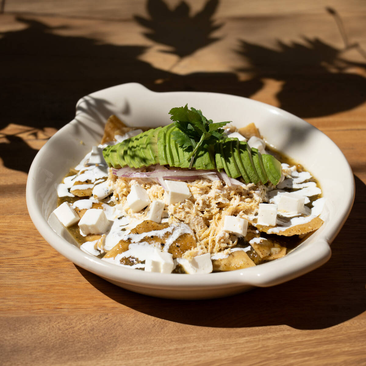 Totopos bañados en nuestra clásica salsa suiza, con pollo deshebrado, queso, crema, y un toque de cebolla morada.