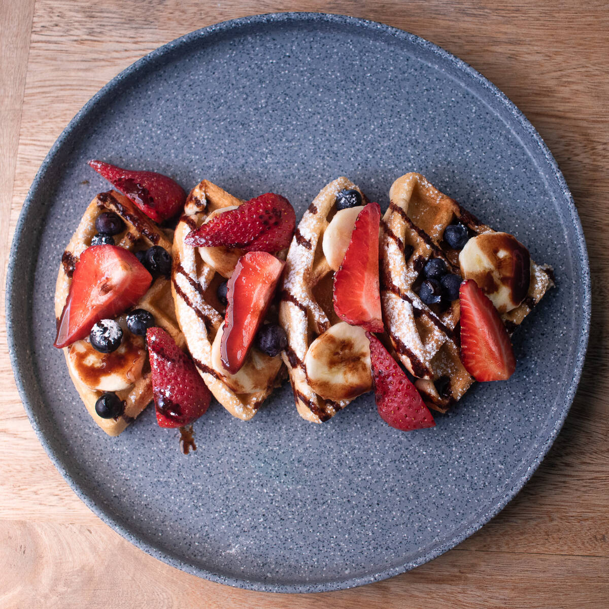 Waffle de matcha con fresa y compota de frutos rojos, decorado con azúcar glass.