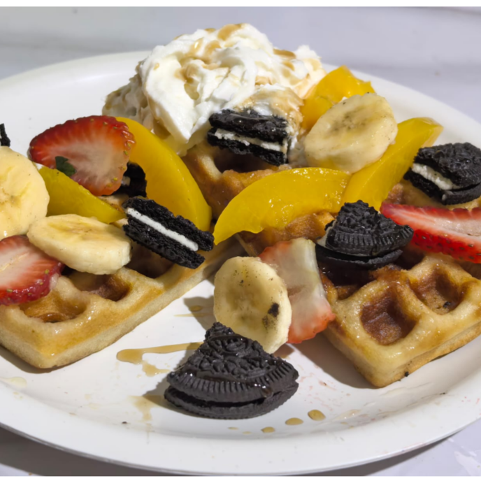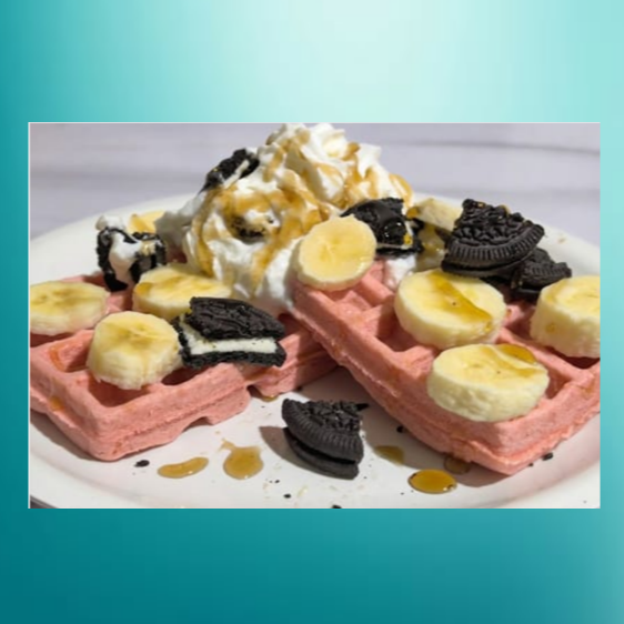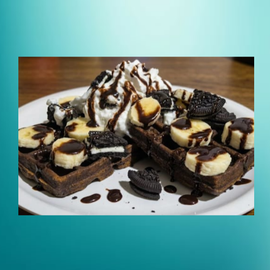 Waffle sabor chocolate con galleta Oreo acompañado de platano, bañado en jarabe de chocolate.