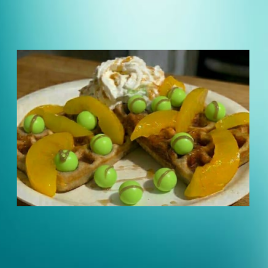 Waffle sabor rompope acompañado con chocoretas y duraznos, todo bañado en cajeta.