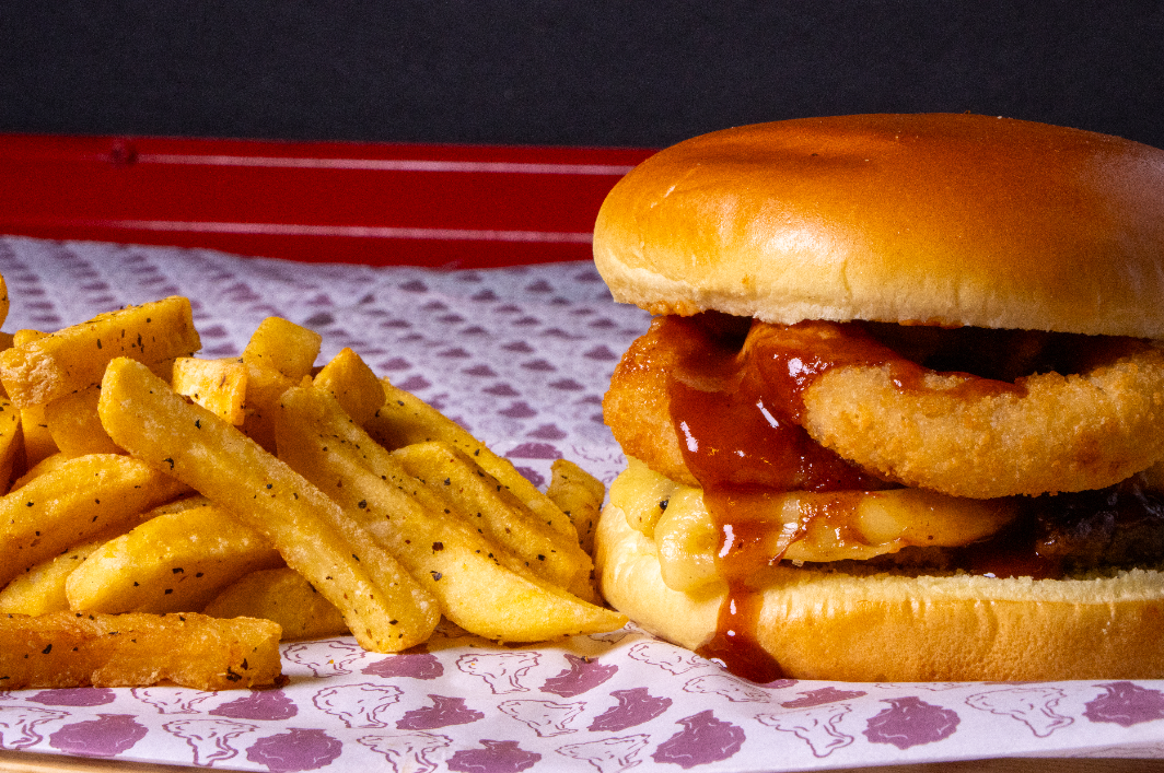 Sabrosos 180 g de carne de res con aros de cebolla, queso derretido y salsa grill BBQ dulce y ahumadita. Actitud de barrio y sabor que pega fuerte, con 220 g de papas para completar el viaje.